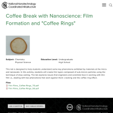 This lab, presented by the National Nanotechnology Coordinated Infrastructure, will help students begin to understand nanotechnology, specifically behaviors of materials at the nanoscale. Students will "explore two factors affecting the thin film deposition, film cracking and the formation of 'coffee rings.'" A teacher's preparatory guide is included, featuring needed materials, detailed procedural instructions, and additional resources, as well as a copy of the student worksheet with answers. The student worksheet is available as well.