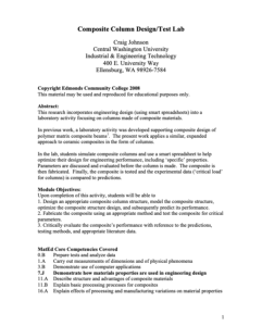 This seven-page laboratory activity guide from Edmonds College introduces undergraduate students to how materials properties are used in engineering design across a modular activity spanning 3-5 class sessions. Students simulate the use of composite columns, use spreadsheets to optimize design for performance, and learn about composite design, fabrication, and evaluation. This activity includes the following sections: MatEd Core Competencies Covered, Module Objectives, Module Data, Equipment and Supplies Needed, Curriculum Overview, Module Procedures, and Evaluation Packet.