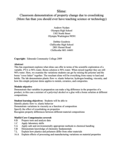 This five-page instructor guide from Edmonds Community College outlines a laboratory activity that demonstrates plastic flow vs. elastic flow behaviors, hydrogen bonding, and viscosity to students using slime in one class period. This "simple polymer demo applies to metals, ceramics, and composites." This activity demonstrates the effect of crosslinking on material properties and the differences between material compositions. The guide includes the following sections: MatEd Core Competencies Covered, Module Objectives and Student Learning Objectives, Module Data, Equipment and Supplies Needed, Curriculum Overview, Module Procedures, and an Evaluation Packet.