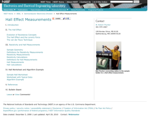 The website is provided by the National Institute of Standards and Technology (U.S.) and provides information on Hall effect measurements. "TheĀ objective of this Web site is twofold: (1) to describe the Hall measurement technique for determining the carrier density and mobility in semiconductor materials and (2) to initiate an electronic interaction forum where workers interested in the Hall effect can exchange ideas and information."