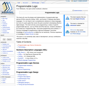 This Programmable Logic Wikibook covers the design and implementation of programmable logic devices. The book includes a Table of Contents, Terminology, and the following sections: Hardware description Languages (HDL), Programmable Logic Devices, Programmable Logic Design, and Appendices. This book is intended for advanced readers and users should first read the Digital Circuits Wikibook.