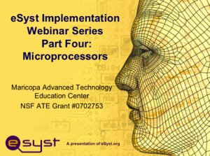These webinar slides, provided by Maricopa Advanced Technology Education Center (MATEC), accompany a webinar that was recorded January 29, 2010. The webinar was presented by Thomas McGlew, eSyst Project Manager. The eSyst project was "conceived to address the systems view of electronics to meet industry's current needs, develop new systems resources, create a guide to help facilitate the changes, and encourage colleges to update programs." The microprocessor implementation webinar includes demonstrations of several microprocessor labs. The presentation includes an overview of the eSyst project, a review of the eSyst implementation guide, a demonstration of a security monitor and control system lab, a demonstration of a microprocessor, a tour of the accompanying web site, and a survey and list of final questions. These slides are part four of a six-part webinar series provided by eSyst.