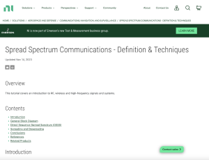 This tutorial is provided by National Instruments and is an introduction to spread spectrum for communications. This tutorial includes a table of contents and the following sections: Introduction, General Block Diagram, Direct Sequence Spread Spectrum (DSSS), Spreading and Despreading, Conclusions, References, and Related Products.
