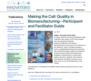 This Bio-Link webpage includes information about Making the Call: Quality In Biomanufacturing Participant and Facilitator Guide that is intended to support the interactive video production of the same name. The purpose of the video "is to prepare students to work in a regulated biomanufacturing environment." The guide provides information about the biomanufacturing and biopharmaceutical industry and can be used without watching the video.