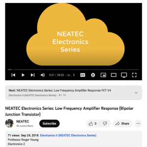 This video, made available by the Northeast Advanced Technological Education Center (NEATEC), is part of the NEATEC Electronics II Series from Professor Roger Young. This video describes the low-frequency amplifier response for the bipolar junction transistor amplifier. The recording runs 38:02 minutes in length.