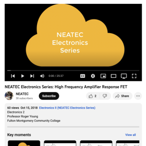 This video, made available by the Northeast Advanced Technological Education Center (NEATEC), is part of the NEATEC Electronics II Series from Professor Roger Young. This video describes the high frequency amplifier response from the field effect transistor amplifier. The recording runs 23:57 minutes in length.