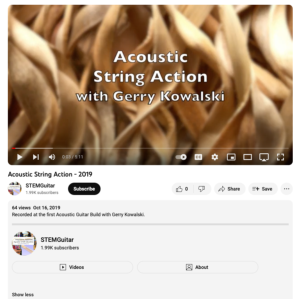 This video, from the STEM Guitar Project, was recorded at the first Acoustic Guitar Build Institute that was held at Hanford High School in 2019. During this part of the workshop, Gerry Kowalski checks the height and the angle of the strings on an acoustic guitar during the building process. Throughout the video Kowalski troubleshoots with workshop participants and answers questions. The video runs 5:11 minutes in length. Additional videos from the workshop cover acoustic body and neck set up, neck angle and shims, and stringing the guitar. These videos are available to view separately.