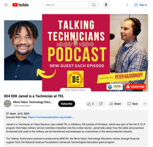 This episode of the Talking Technicians podcast, from the Micro Nano Technology Education Center (MNT-EC), features an interview with Jamel, a semiconductor technician for Tokyo Electron Limited (TEL). The interview covers the day-to-day responsibilities of maintaining and fixing TEL tools in an Intel semiconductor fabrication plant (FAB), communication between technicians in a FAB, transferable skills from the military, and more. Highlighted is Alberto's journey from the military to working as a technician through a Vet S.T.E.P (Veteran Semiconductor Training & Experience Program) apprenticeship.
