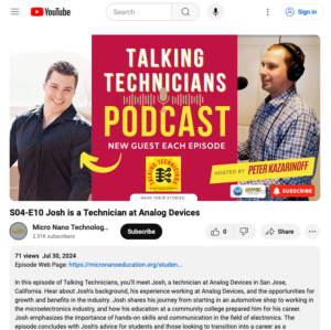This episode of the Talking Technicians podcast, from the Micro Nano Technology Education Center (MNT-EC), features an interview with Josh, a technician at Analog Devices in San Jose, California. The interview covers Josh's day-to-day work as a technician, Josh's background, the impact of working as a technician on Josh's life, and more. Emphasized is the importance of hands-on-skills in the field, as opposed to classroom learning, and communication in the electronics field.