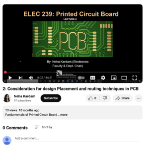 This video was created by Neha Kardam and is part of a series of lectures on printed circuit board design using Ki-CAD software. This lecture discusses considerations for design, placement, and routing techniques. The video goes further into types of rigid PCBs, component placement, routing challenges, electrical considerations, and decoupling capacitors.