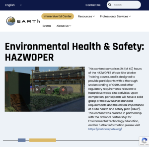 This web page, from the Environmental and Natural Resources Technology (EARTh) Center, provides 24 (of 40) hours of the HAZWOPER Waste Site Worker Training course. This course is intended to give participants an understanding of OSHA and other regulatory requirements related to hazardous waste site activities. The course includes the following modules: Regulations Overview, Site Characterization, Health and Physical Hazards, Hazard Recognition, Radiation Hazards, Respiratory Protection, PPE Clothing and Ensembles, Site Control, Decontamination, Medical Surveillance, Air Monitoring, Emergency Procedures, and more. Most modules include a quiz and some include simulation activities.