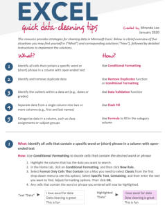 This four-page resource sheet from EvaluATE: Evaluation Resource Center for Advanced Technological Education provides strategies for cleaning data in Microsoft Excel. This resource gives an overview of five common scenarios encountered when working with data in Excel. For each scenario, this guide supplies solutions and step-by-step instructions to implement those solutions. Excel functions covered include conditional formatting, duplicate removal, data validation, flash fill, and formulas.