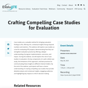 This webinar from EvaluATE: Evaluation Resource Center for Advanced Technological Education explores case studies as an evaluation tool for ATE projects. The webinar begins by defining case studies and providing reasons to use case studies in evaluation. Topics covered include selecting a case, case study questions, data collection methods, ethics, and report structure. Examples of different report structures are shared. The webinar concludes with a discussion on writing considerations and presentation methods for external audiences.