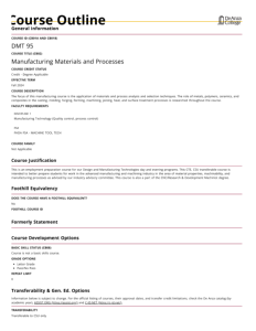 This 4-page course outline provides general information about the Manufacturing Materials and Processes course taught at De Anza College. This course focuses on the application of materials and process analysis and selection techniques. The following are researched throughout the course: the "... role of metals, polymers, ceramics, and composites in the casting, molding, forging, forming, machining, joining, heat, and surface treatment processes."