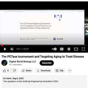 This video recording from Digital World Biology features two speakers who presented at the 2025 Antibody Engineering Hackathon. The hackathon provides undergraduate students with an opportunity to create research projects related to antibody engineering. The first presentation is from Bijoy Desai, PhD, technical project manager at the Align Foundation. Desai presents on the PETase Tournament, a protein engineering competition. The second presentation is from Ben Blue, PhD, chief technical officer and co-founder of Ora Biomedical. Blue presents on longevity intervention research performed at Ora Biomedical.