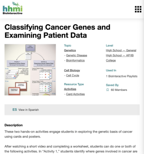 This web page from HHMI BioInteractive provides two activities to engage students in "exploring the genetic basis of cancer using cards and posters." In the first activity, a set of 139 cards and associated posters help students locate genes on human chromosomes. In the second activity, students learn about genetic mutations in cancer patients using cards. Activity resources include an educator guide and .zip folders of activity documents, gene activity cards, and patient activity cards. The educator guide overview contains activity summaries, key concepts, learning objectives, rubrics, and references. The documents .zip folder includes the handouts, cards, and posters. All resources are also available in Spanish.