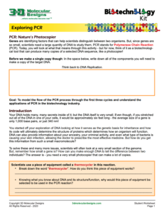 This nine-page activity guide from 3D Molecular Designs shows students how to model the PCR (polymerase chain reaction) process through its first three cycles using foam nucleotides. Students complete a storyboard activity and view diagrams that illustrate how the PCR process works. By completing these activities, students gain an understanding of the applications of PCR in the biotechnology industry.