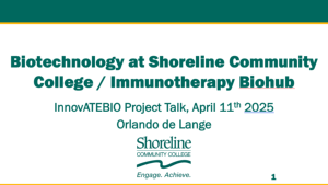 This PowerPoint presentation from Shoreline Community College and Dr. Orlando de Lange was given to the InnovATEBIO community in April 2025. The presentation provides information about Dr. de Lange, Biotechnology programs at Shoreline Community College (SCC), and the Immunotherapy BioHub Advanced Technological Education (ATE) grant. The PowerPoint covers Shoreline's role in strengthening the cell and immunotherapy technician workforce, describes the Kit Loan Program and the Essentials of Biomanufacturing Certificate, and shares lessons learned from workforce development and outreach efforts. Hands-on laboratory education, industry partnerships, and expanding access to biotechnology careers for students and educators across the region are also covered.