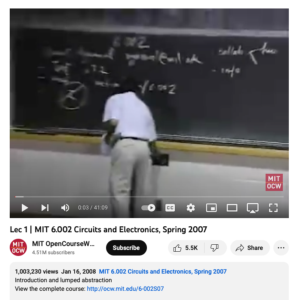 This is a video recording of the introductory lecture for Massachusetts Institute of Technology’s (MIT) course 6.002, Circuits and Electronics. It is designed to serve as the first course in an undergraduate electrical engineering or electrical engineering and computer science curriculum. Topics covered include: resistive elements and networks; independent and dependent sources; switches and MOS transistors; digital abstraction; amplifiers; energy storage elements; dynamics of first- and second-order networks; design in the time and frequency domains; and analog and digital circuits and applications. The production and distribution of this recorded lecture is part of MIT OpenCourseWare, an initiative of the Massachusetts Institute of Technology to put all of the educational materials from its undergraduate and graduate-level courses online and make them freely accessible.