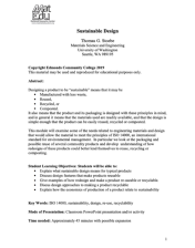 This five-page instructor guide from Edmonds Community College provides a lesson plan on sustainable product design. The guide provides the outline for a PowerPoint presentation, a discussion guide, and exercises for students to complete. The lesson examines ISO 14000, a family of international...