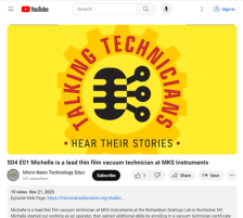 This episode of the Talking Technicians podcast, from the Micro Nano Technology Education Center (MNT-EC), features an interview with Michelle, a lead thin film vacuum technician at MKS Instruments at the Richardson Gratings Lab. During the interview, Michelle provides an overview of thin film...