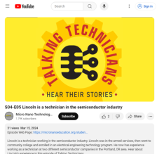 This episode of the Talking Technicians podcast, from the Micro Nano Technology Education Center (MNT-EC), features an interview with Lincoln, a field service engineer at Intel. During the interview, Lincoln discusses the logistics and day-to-day tasks of maintaining and troubleshooting the tools...