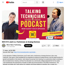 This episode of the Talking Technicians podcast, from the Micro Nano Technology Education Center (MNT-EC), features an interview with Josh, a technician at Analog Devices in San Jose, California. The interview covers Josh's day-to-day work as a technician, Josh's background, the impact of working as...