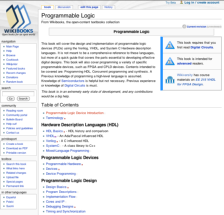 This Programmable Logic Wikibook covers the design and implementation of programmable logic devices. The book includes a Table of Contents, Terminology, and the following sections: Hardware description Languages (HDL), Programmable Logic Devices, Programmable Logic Design, and Appendices. This book...