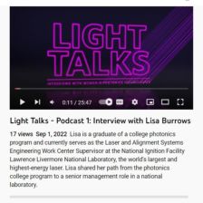 This episode of the Light Talks podcast from LASER-TEC provides an interview with Lisa Burrows, the Laser and Alignment Systems Engineering Work Center Supervisor at the National Ignition Facility Lawrence Livermore National Laboratory. In the episode, Burrows discusses her educational background in...
