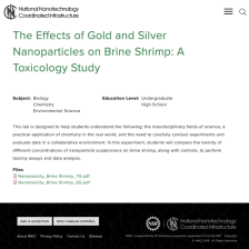 In this lab, from National Nanotechnology Coordinated Infrastructure, students will study nanoparticles, specifically dilutions of gold and silver. Students will study brine shrimp and explore "...the effects of exposing living organisms to different nanoparticles at various concentrations." There is a twenty-one page teacher's preparatory guide, containing: lists of equipment and materials needed, activity procedure, and student guide with answer key. The student guide is also available as a separate PDF document.